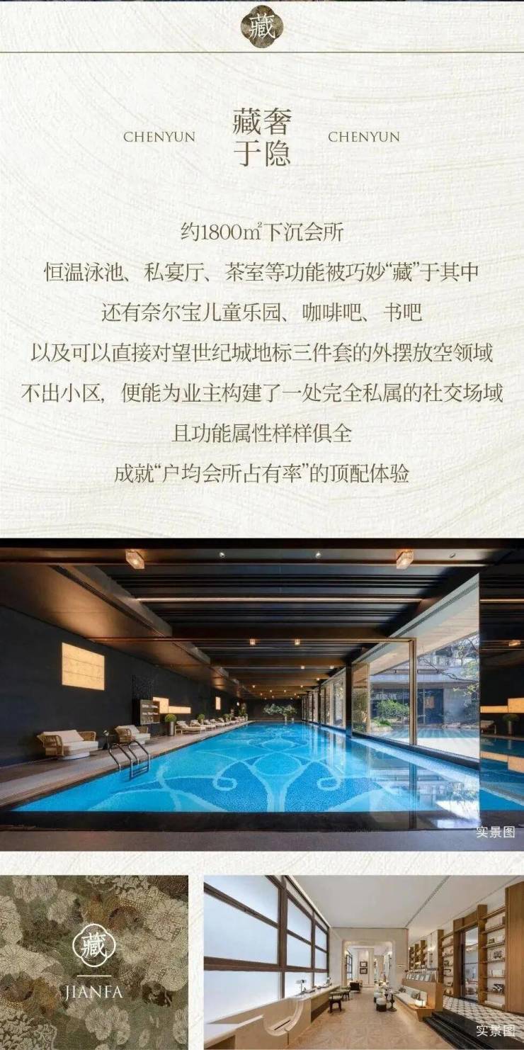 首先从小区品质来看,宸云并不是那种混合刚需与改善的综合盘,而是纯粹为改善群体定制。164户的体量,配上约1800方的下沉式会所,恒温泳池、私宴厅、健身房、书吧等功能一应俱全,真正实现了“少数人的圈层生活”。