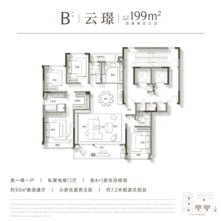 高层均为建面约199㎡的大平层户型,极致纯粹的业主圈层,带来更为尊贵的居住体验。其户型设计尽可能扩宽南向开间的同时,展现出了极为阔绰的空间尺度,足以满足多代同堂的居住需求,成为众多购房家庭终极改善的首选。