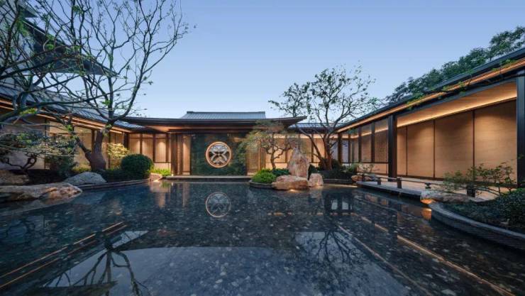 主背景雪山兰奢石,纹如凝山,静显稀贵。穿过大门就是二进迎客,借用柳岸闻莺的空间布局,还原“深柳叫黄鹂,清音入空翠”的西湖风光,同时还复刻花港观鱼的锦鲤池,营造临渊羡鱼的惬意场景。