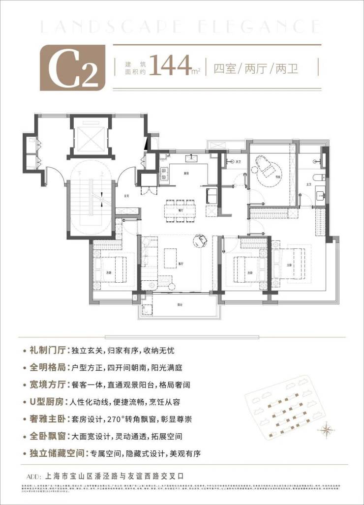 约144㎡四室两厅两卫(四开间朝南,大横厅+270°环幕飘窗,得房率约80%)