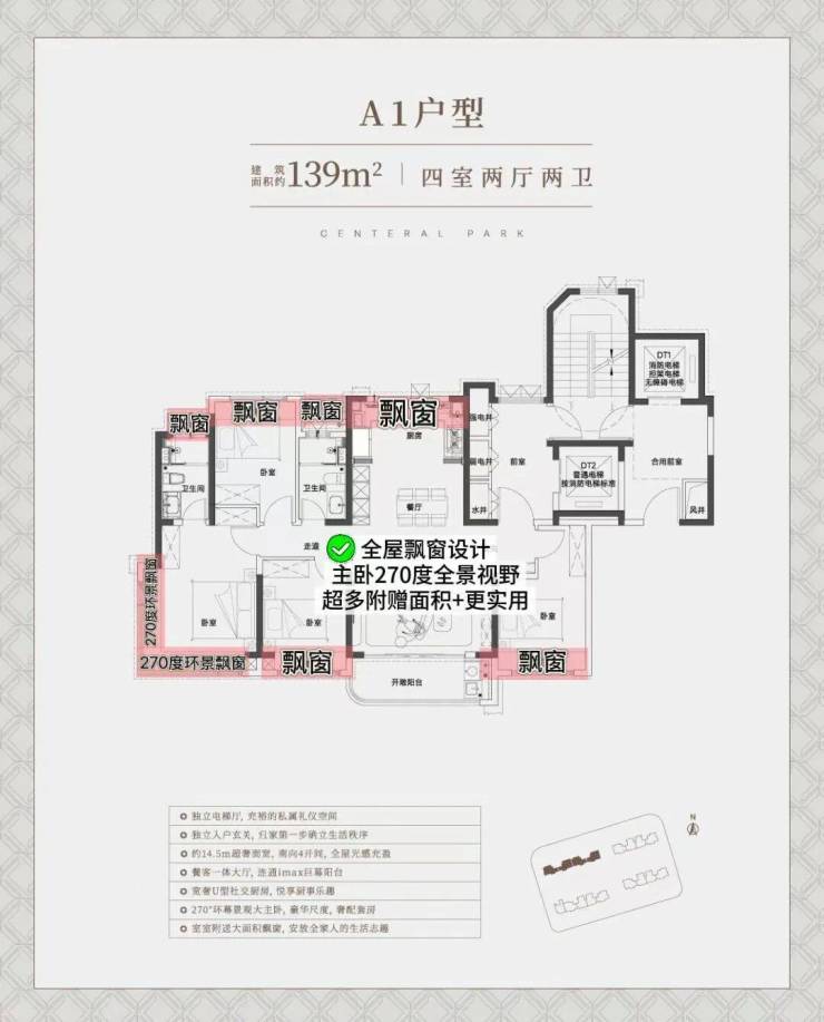 建面约 139㎡ 四房两厅两卫:总价区间877-1059 万,核心亮点为四开间朝南、南向面宽约 15.05 米、270° 转角飘窗、LDKB 一体化布局