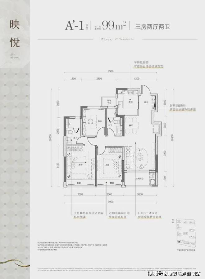 该边套户型,不仅有270度的采光视野,主/次/客卧三大开间并立朝南,“含阳光量”十足。