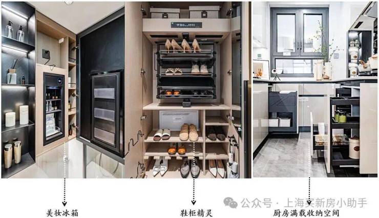 还有室内越级Pro的精睿收纳、超配臻装的品牌用材等空间革新,重塑家庭生活的精神尺度!特别是入户部分的玄关柜、墙柜、餐边柜等,都做了整排一体化,前期同样使用大受好评的S墙设计依旧得到延续,冰箱可以平整嵌入,大方美观。