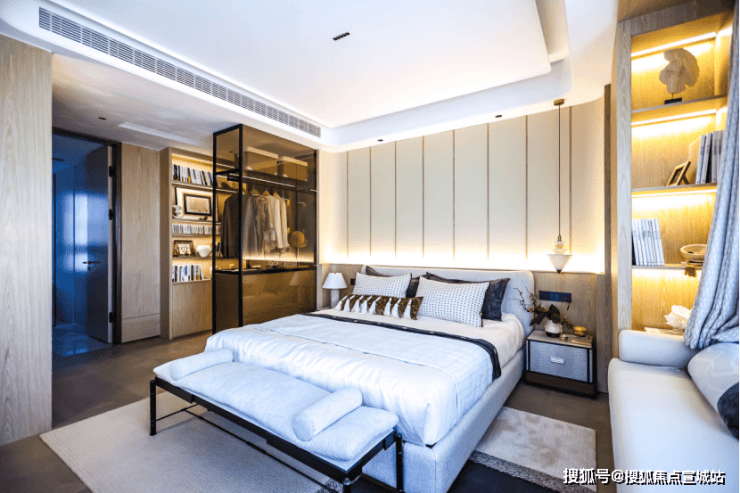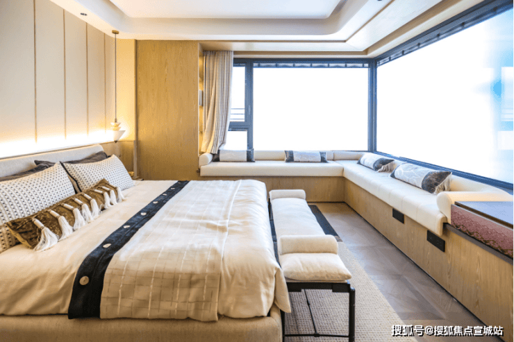 其中边户的主卧套房更是点睛之笔,配备270度转角飘窗,将天空与城景化为日常背景墙,更大拓展了空间感与居住心境。背景墙采用皮革硬包与实木圆弧造型拼接,搭配异形拼花地板,氛围温馨典雅。