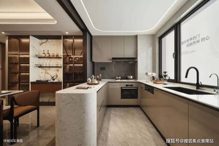 流线岛台 -- 参考园林月亮门设计室内动线中的流线笔触,柔和生活质感
