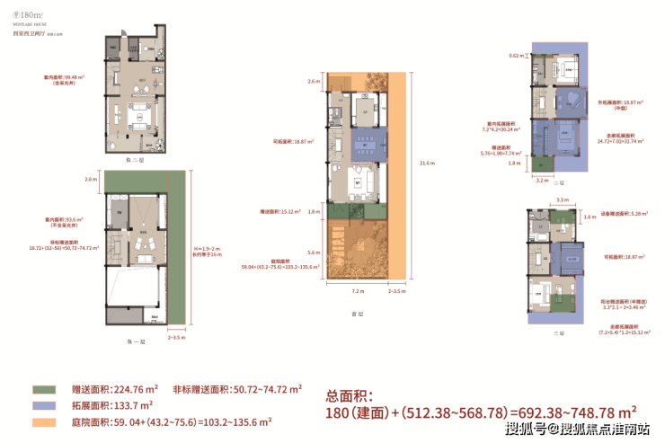 以建筑面积约180方的样板房为例,设计为四房两厅两卫,一层为客餐厅和厨房,约5.8米的面宽,阔绰有余,南面还可享受50-300平米不等的私家庭院;