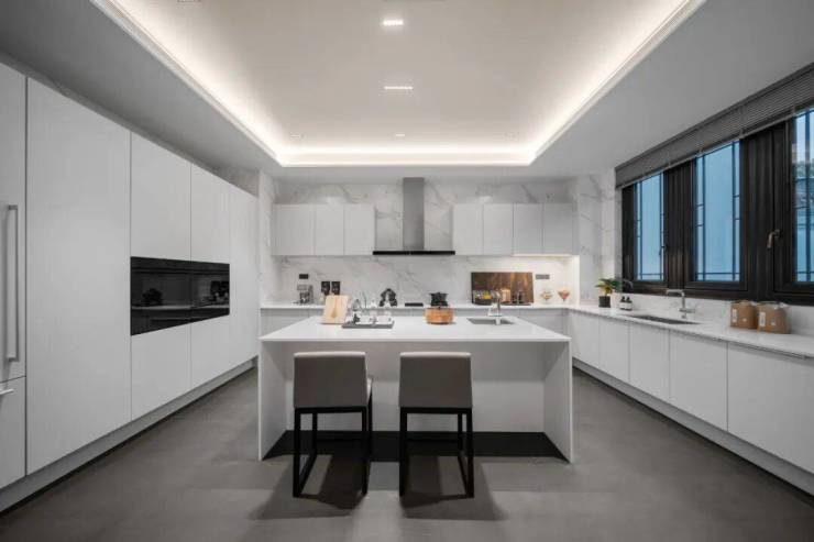 它的入口是定制游艇甲板级入户门,客厅大面积铺装意大利蓝金沙大理石,室内也全是ARMANI/Dada、意大利Poliform等一线大牌。