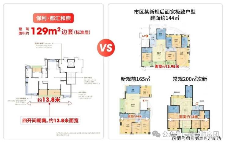 常规别墅多为两开间约6米面宽,而项目129㎡洋房全系四开间朝南,面宽近14米。