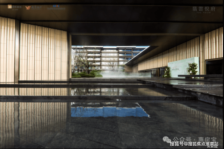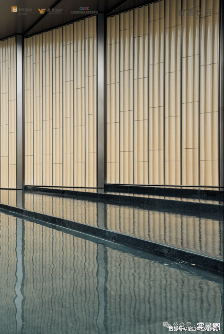 入口处选用了大面积冰裂琥珀釉陶板,背后的工序非常复杂,从选材到运输,最后拼接,每个环节都是高成本和高技的工艺工法。水晶景观庭院在动与静之间,细节到了流水、园林里,值得一提的是,庭院里的水,并不是静态,而是有涟漪的流动,同时为了保证低区业主不被流水声音干扰,特意做了“静音水”。这一现象的背后,是1300多块安哥拉石材的切割与拼接,完全是把细节拉满。