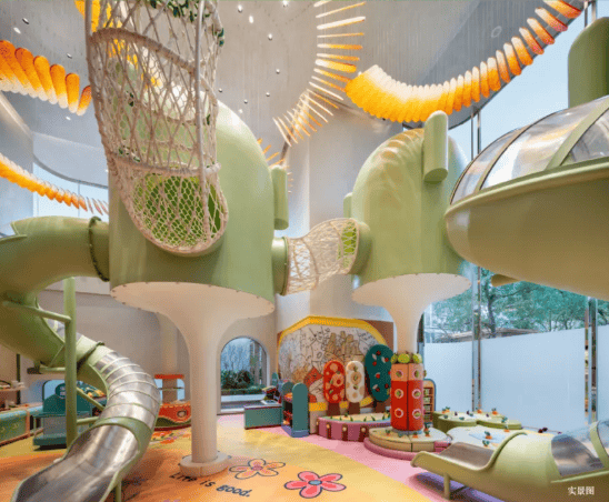 「知乐园」儿童乐园除了这个近8米的超高空间打造的沉浸式童玩区,还有绘画室、陶艺坊、四点半学堂一应俱全,整体引光入室,让孩子在明媚中自由奔跑。