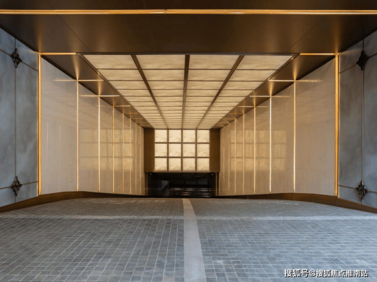 步入社区,约95米长的西大门长廊率先映入眼帘,乱纹黄古铜饰面与深色奢石大理石碰撞,顶部金属铝板立体切割,彰显归家仪式感!大门内侧,照壁以中国黑石材与青白石组合,延续空间礼序!