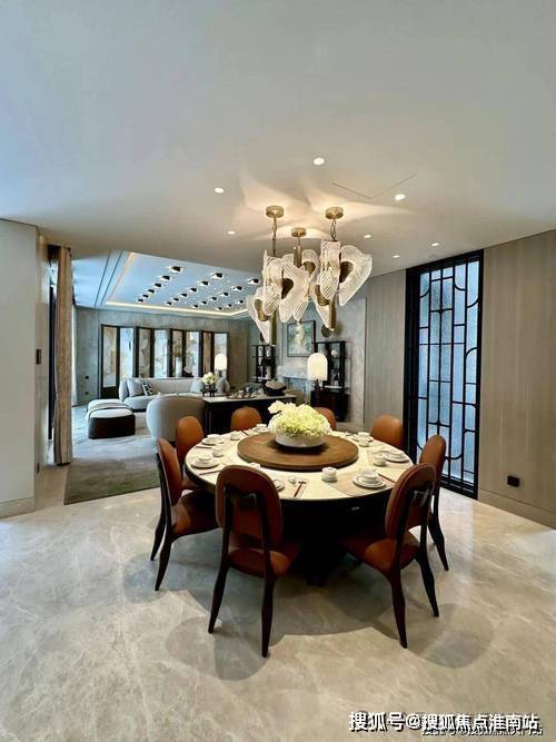 ✅士林润园营销中心热线4008875663(官方预约看房热线)餐厅的设计巧妙融合了老上海的经典元素,圆形餐桌和橘色皮质餐椅在色彩上既现代又充满活力,顶部的水晶吊灯造型灵感来自上海市花“玉兰花”,既增添了空间的华丽感,又巧妙地融入了上海的地域特色。