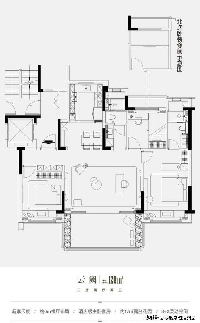设计亮点:零公摊设计(实际使用率超100%),6米横厅、U型厨房、灵动X空间等