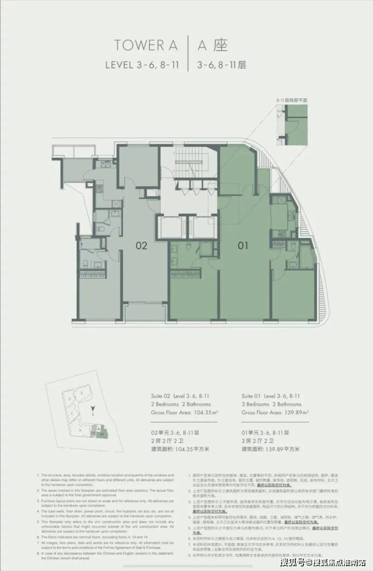 A座 建面约104㎡&139㎡,3-6,8-11层平面图