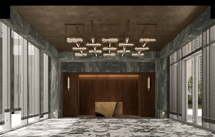 项目采用地上+地下三层同标准精装入户大堂,一楼大堂层高约6.6米,大堂选用有着媲美艺术品表现力的亚马逊绿天然奢石!