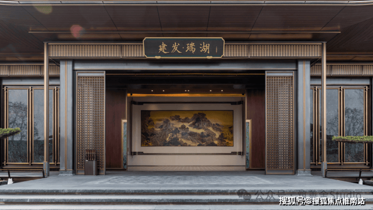 金山少见的双门规制,东门气势也尤为磅礴。步入其中,《蓬莱仙境》非遗漆画与西区山河遥相辉映,烟波浩渺处,藏风聚气,基业长青之意境油然而生。