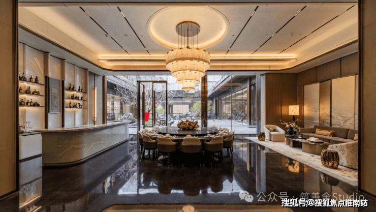 下沉庭院,亭台轩阁依山傍水,各展风姿。循《西园雅集图》之韵,园林雅趣尽收眼底。春波小筑临水而筑,飞檐倒影相映成趣,绘成立体画卷。松涧鸣泉处,松涛与泉韵交织,一株凌冬不凋的碧琳冬青,静蕴福泽绵长。陶然亭内,海棠纹花窗将四季美景尽收眼底;听风亭深藏竹林,唯有风拂竹叶的清音,让心境豁然开朗。园中百年金桂静待秋来,届时馥郁芬芳弥漫,满园风雅尽染甜香。超长八角长窗,将七米叠石瀑布全景尽收眼底,水声如鼓,静庭似诗,相映成趣。庭院中央,百年海棠静立,花开时节云雪满枝,寓意圆满丰盈。
