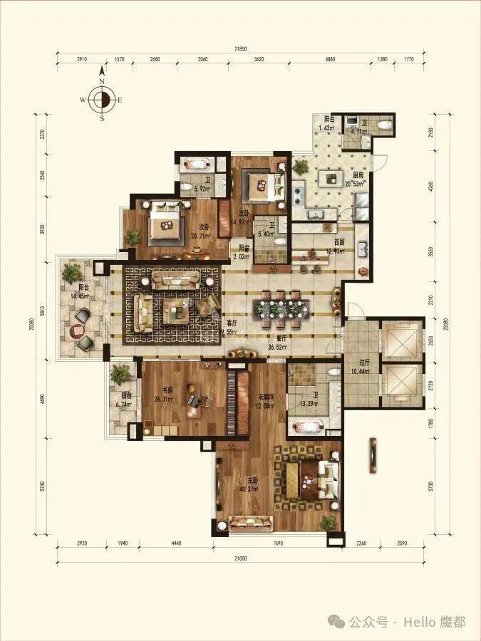 2、3个卧室(全套房设计)+1个开放式书房+中西双厨+保姆套房+私梯入户