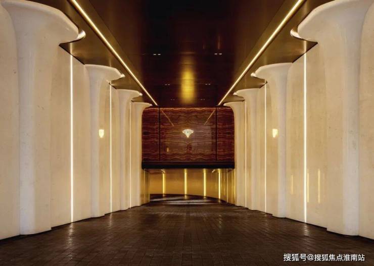 6、社区含“奢材”量很高。门庭延街的外立面,以精工定制弧形米色石材为主调,镶嵌典藏级老虎玉大理石,点缀古铜色现代海派艺术感灯器,整体呈现出百年海派的贵雅气质。