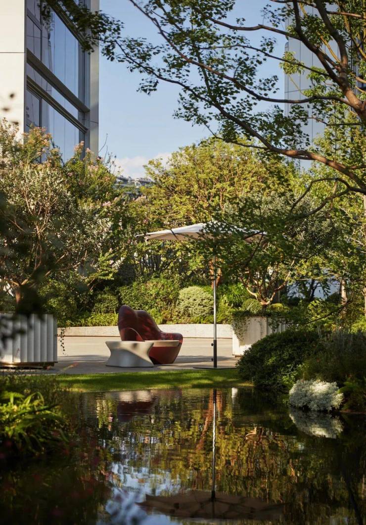 走入T-ONE潮博西区的园区,可以看到一条蜿蜒的水系串联着不同场景,贯穿整个楼盘。在这里,Pok是结合了杭州「钱塘江潮」的在地文化,用溪流与叠水打造出了一座很有度假感的花园。花园中,凡是有户外座椅的地方,就会有微风、树荫与水流的环绕。