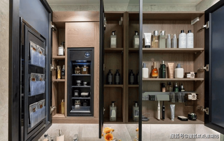项目主卫的镜柜内设计了美妆冰箱和集成柜,不仅可以更好地贮藏名贵化妆品,而且也是更合理的化妆动线设计。