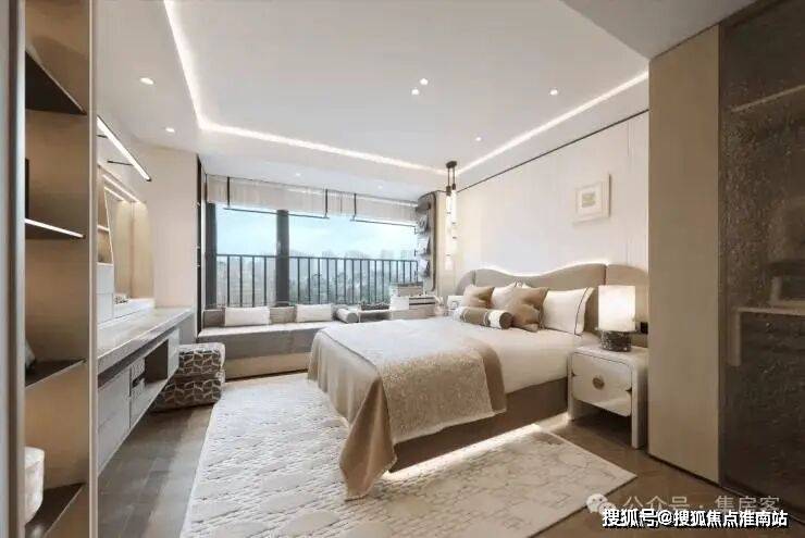 在春来晴翠园 建面约169㎡晴翠户型中,最亮眼的设计显而易见—— 主卧90°转角窗,揽获270°环幕视野,将天光云影尽纳室内。不仅引入绝佳采光与风景,更成为一处心灵栖所。