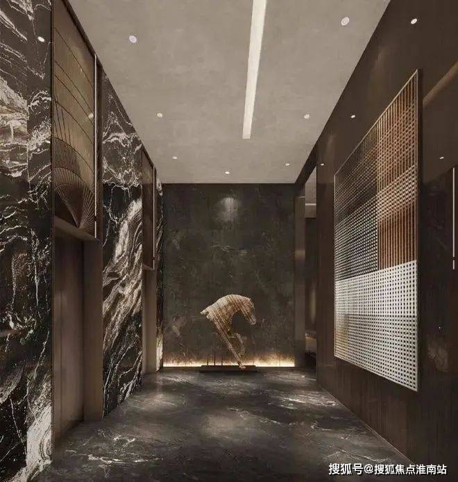 电梯厅装饰材料为高档天然大理石和质感金属