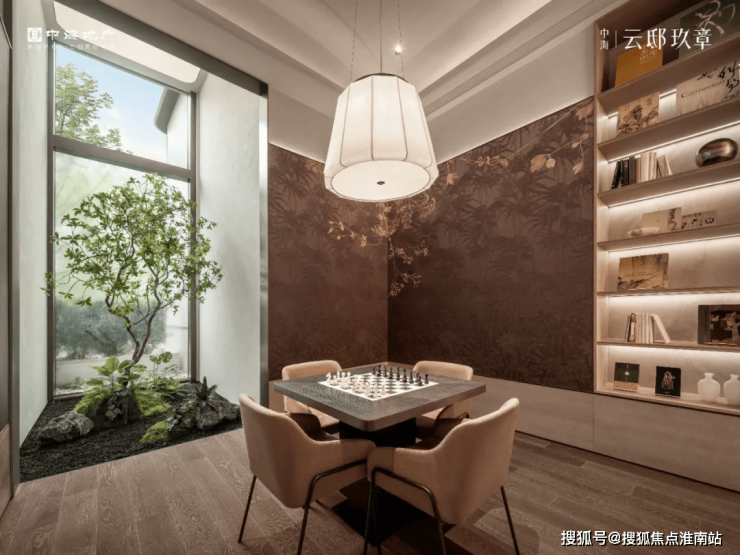 整块奢石打造的吧台,背后就是秸秆手工拼出纹路的高约巨型木质屏风,外面是小区的下沉式庭院,视觉上有豁然开朗的感觉。