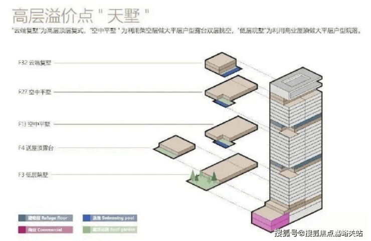 叠拼面积段约195-310㎡,分为1-2F下叠、3、4、5F为中间的平层面积236㎡,6-7F为上叠,计56套。