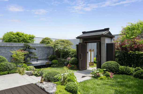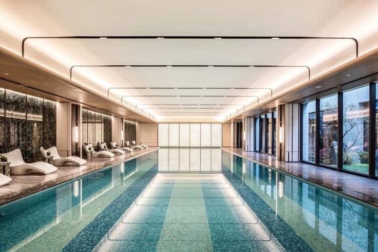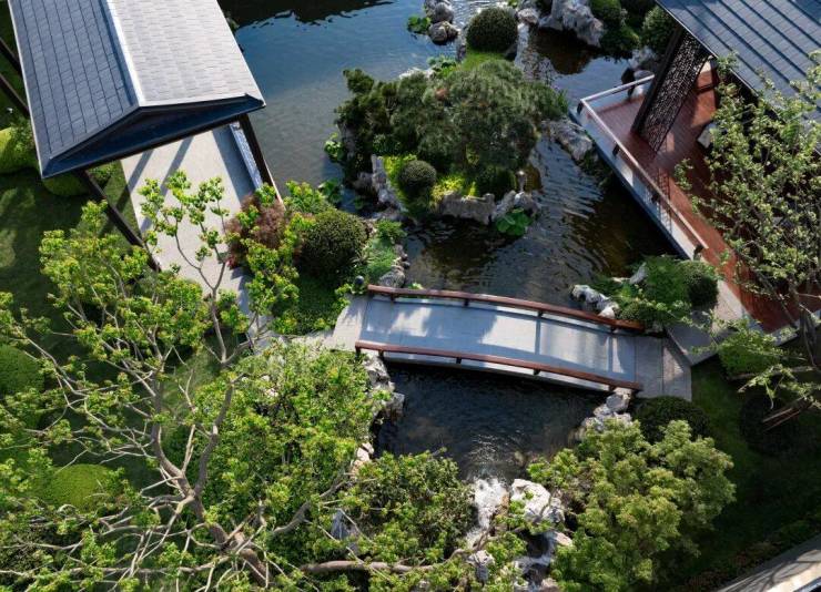 在会所中央,设计了充满中式韵味的四水归堂:屋檐四面围合,中间种植舒展松树,承载着中国传统文化中“天人合一”的理学思想。雨季时节,水从四面的檐壁汇聚,寓意着财源风水,也寄托着家人团圆的美好愿望。