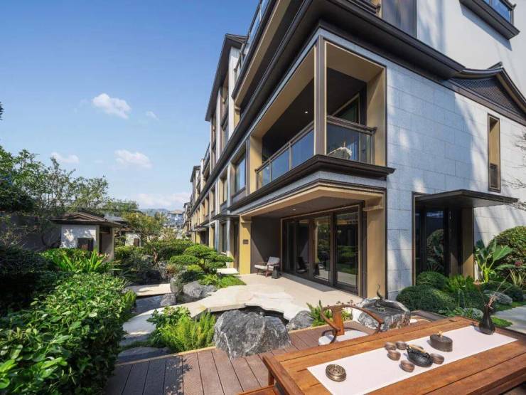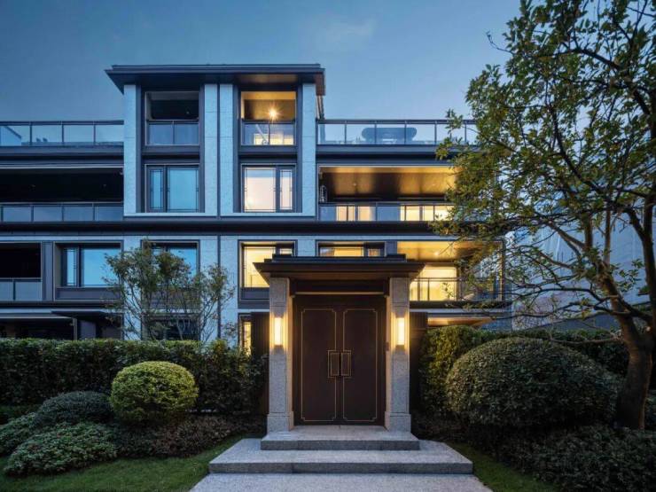 而溪映听庐,正是滨江的下一个景区低密作品,容积率低至1.1,更是请来了gad建筑设计院和香港贝尔高林,操刀设计建筑和景观。立面设计为现代中式建筑风格,有檐口、屋脊的形制。容积率低至1.1,是睥睨全城的稀缺低密项目。