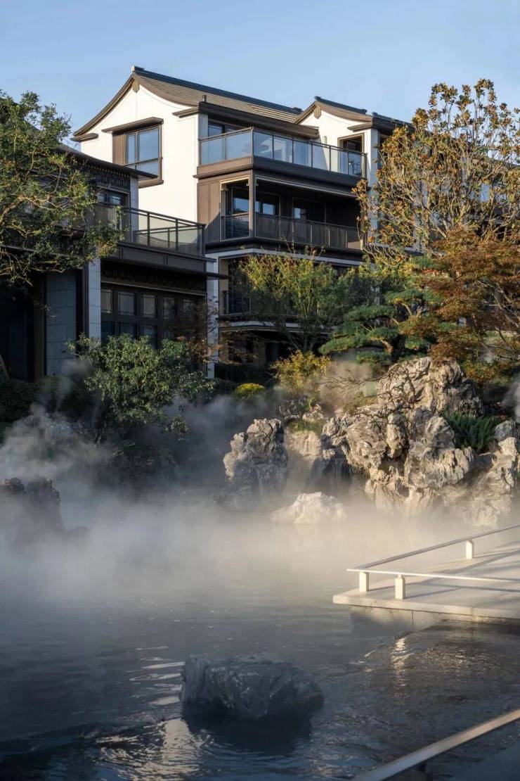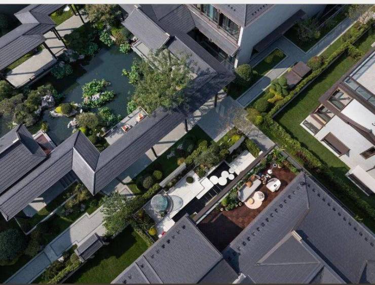 新中式,院墅,中式的坡屋顶与通透的大玻璃立面结合,将东方的传统意境与国际化的审美融合,像极了当前的杭州也像极了此刻的龙坞,既老又新,既传统又现代,既有西子湖的温婉又有钱塘江的磅礴,碰撞出一种全新的审美与生活方式。溪映听庐隆起的屋脊,仿佛群山的绵延,大地与人文交织出全新的风景。