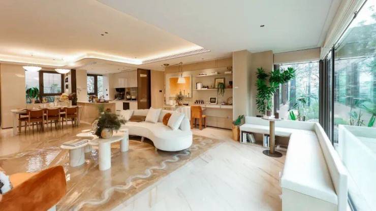 结合局部 弧形玻璃 与 超大窗墙比 ,真正实现了“引景入室”,让家变成公园的观景台,重新定义了居住的视野界限。