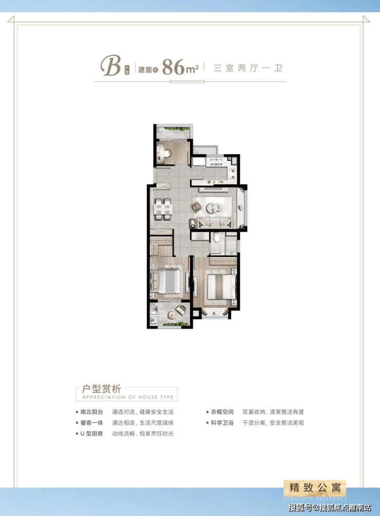 建面约86㎡3房2厅1卫户型特点:做到了双开间朝南+双阳台设计+卫生间干湿分离,一个非常紧凑的小3房户型.