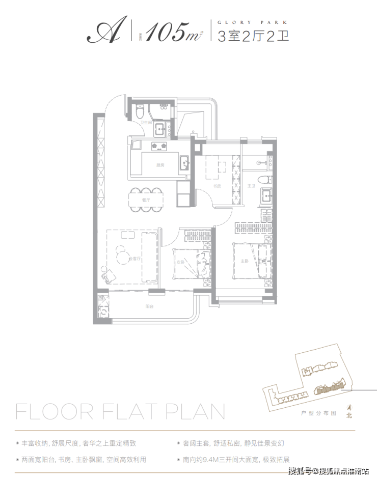 另外,一个优秀户型应该有的设计,包括入户玄关、3间卧室带飘窗、约270度采光面的阳台、卫浴干湿分离...这个户型全部具备。