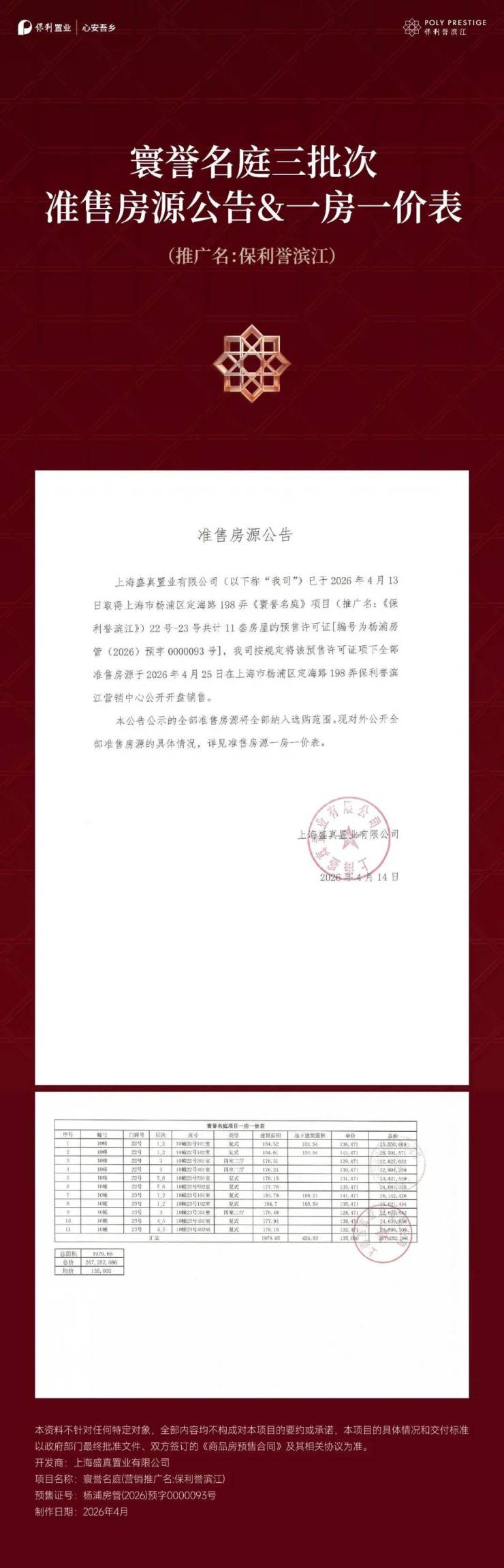 为保障购房者权益,杜绝第三方虚假信息、中介加价、临时到访无法接待等问题,现将保利誉滨江2026年4月25日最新官方信息公示如下,开发商官方认证服务通道正式公示,全程透明、无套路、无隐形收费: