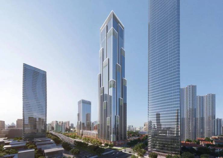 龙盛湾上实际是一个 城市综合体——整个综合体名为「博懋广场」 ,“懋”字有积极向上、勇敢进取的寓意,代表着龙盛想要的,不止是一座城市地标,更要将其塑造为苏河湾蓬勃向上的精神象征。其中,包含一栋约320米超高层塔楼、一栋约150米副塔楼,建筑姿态挺拔向上直冲云霄,建成后将成为静安区第壹高楼,刷新静安城市天际线。