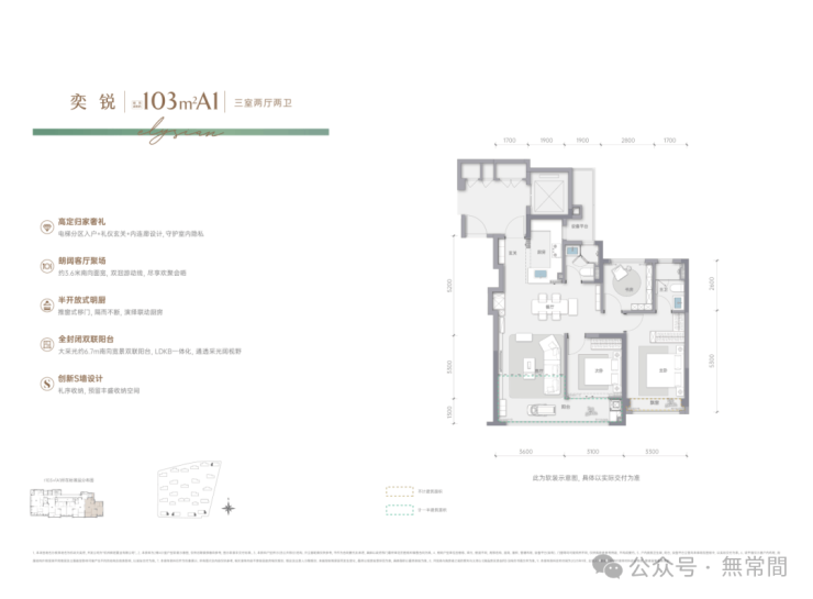 项目打造建面约100-175㎡奢适户型。所有户型均遵循“南向最大化+灵活空间”原则,南向面宽最大达15米,部分户型配备270°环幕观景阳台。