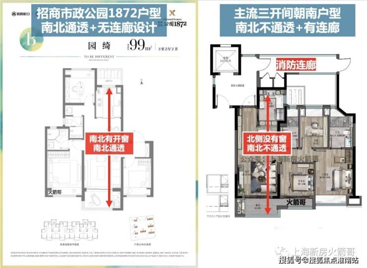 所以,没有连廊设计的公园1872不存在上述问题;同时因为没有连廊,所有户型也都做到了「南北通透」、形成自然对流通风,比起传统三开间连廊户型要好上不少——