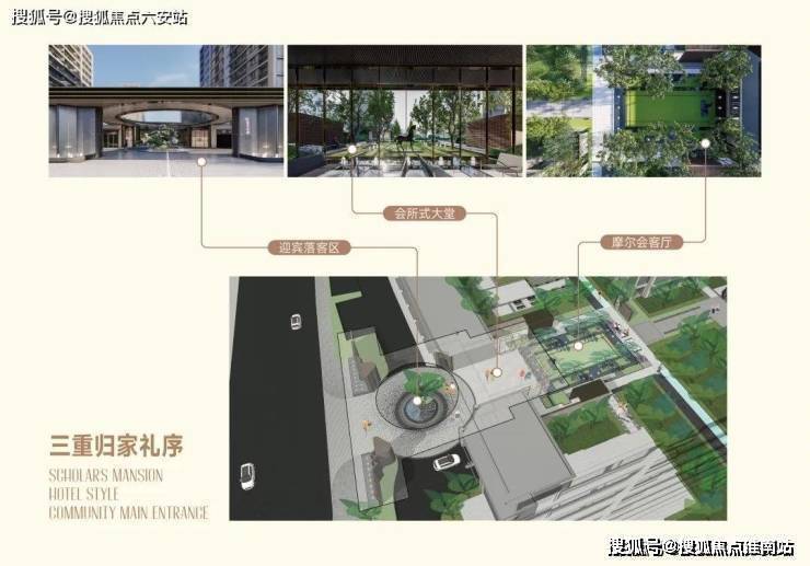 三重礼序尊崇归家之路汲取四季酒店设计精髓,于社区主入口打造豪华酒店大堂式归家设计,以迎宾落客区--会所式大堂--摩尔会客厅的渐进式排布,勾勒出入境--入画--归影的三重归家仪制。