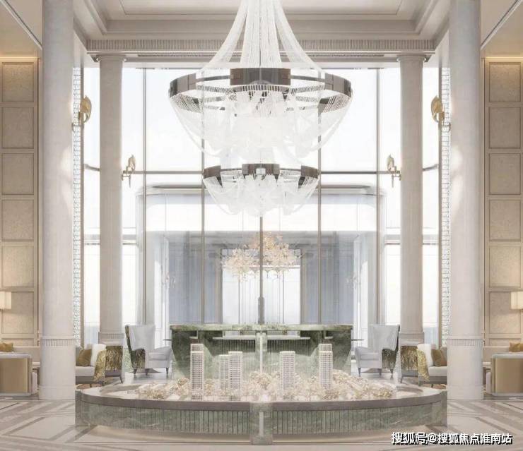 6、 社区含“奢材”量很高。 门庭延街的外立面,以精工定制弧形 米色石材 为主调,镶嵌典藏级 老虎玉大理石 ,点缀 古铜色现代海派艺术感 灯器,整体呈现出百年海派的贵雅气质。