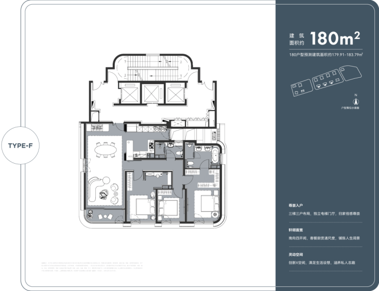 主力户型为建面约180–388㎡的三至四房,另有少量585–744㎡的顶层复式及大宅产品