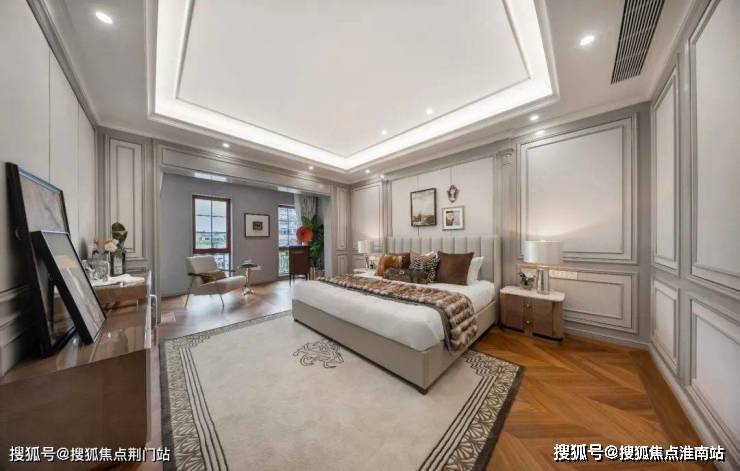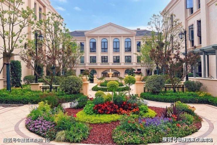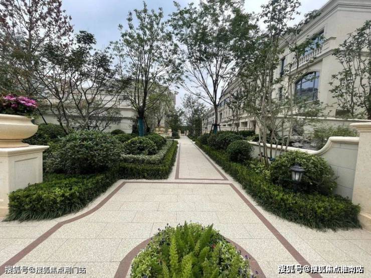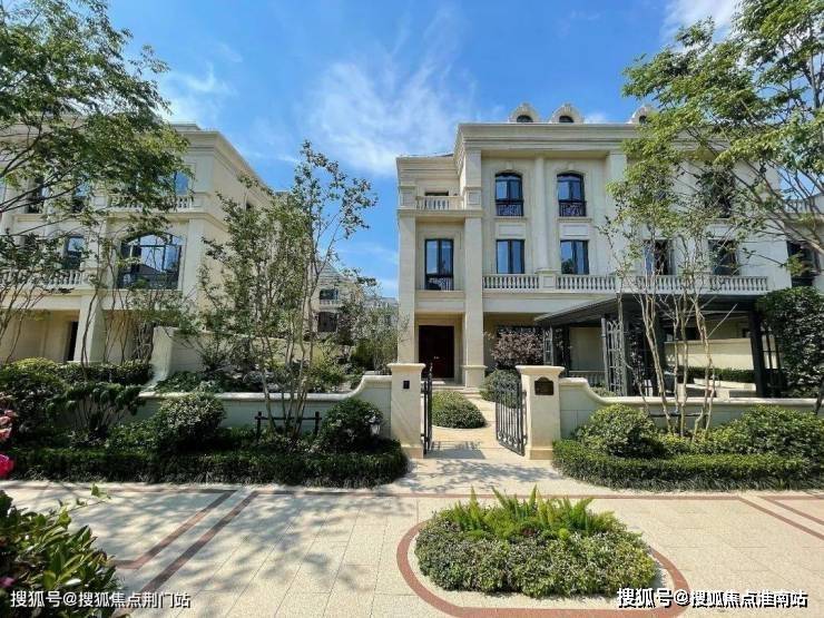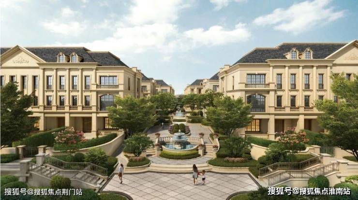 整个园区,以经典的绿城法式墅区景观大中轴贯穿,占地约1000多㎡,联排建筑的设计,融合了中国传统院落布局与法国枫丹白露宫的审美,外立面大面积采用全石材干挂,檐口等细节部位使用仿石。
