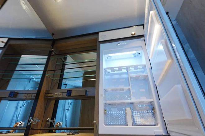 厨房的橱柜板材和107㎡颜色不同,冰箱位置就预留在餐厅一侧。其余配置没什么差别。