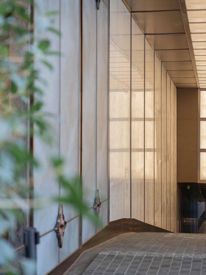 往里走,入口坡道的顶面,以纤细的金属线条勾勒出秩序的骨架,内嵌的透光云石玻璃,于细节处营造上海高端小区车库范本。