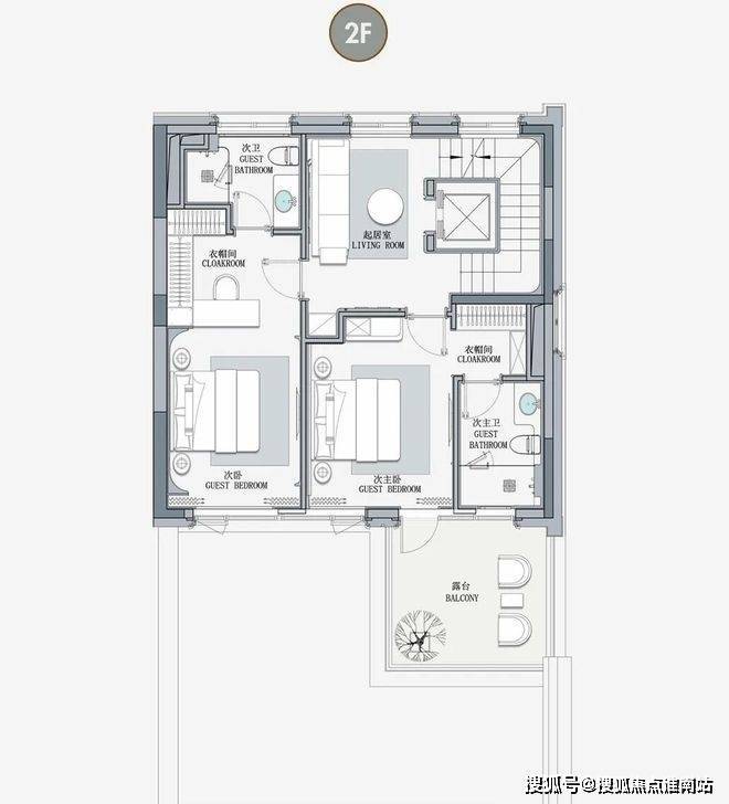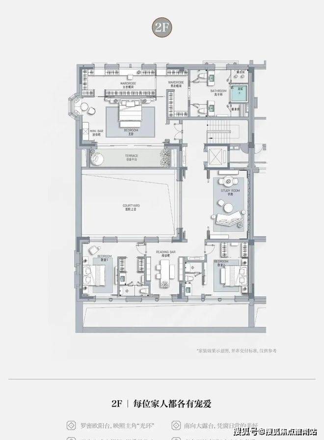 客厅互通,彰显家族生活的轩阔厅堂,2F家庭层,儿女的幸福与陪伴皆在左右,3F总裁套房式Penthouse,用具象的尺度描写人生成就的高度。