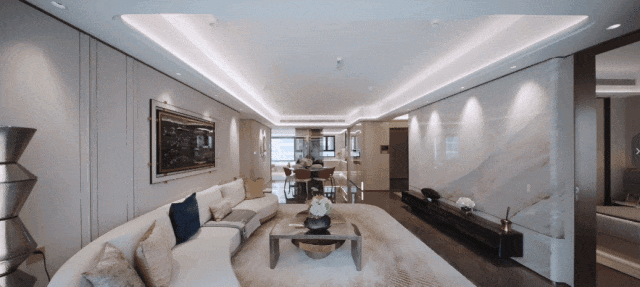 最强的一点是,它的奢感一进入室内就直接扑面而来:奔驰S级轿车内饰同款的白栓影木木饰面&仿石拼花瓷砖的玄关、客厅背景墙是星级酒店同款的一整面白金沙,加上卫浴间采用艾伦蓝、卡里冰玉、佩纳深蓝等奢石铺装,奢石含量严重超标;