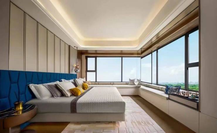 朗云在主卧采用270°环幕景观飘窗,打开观景的极致视野。尺度真是大到惊人的程度。
