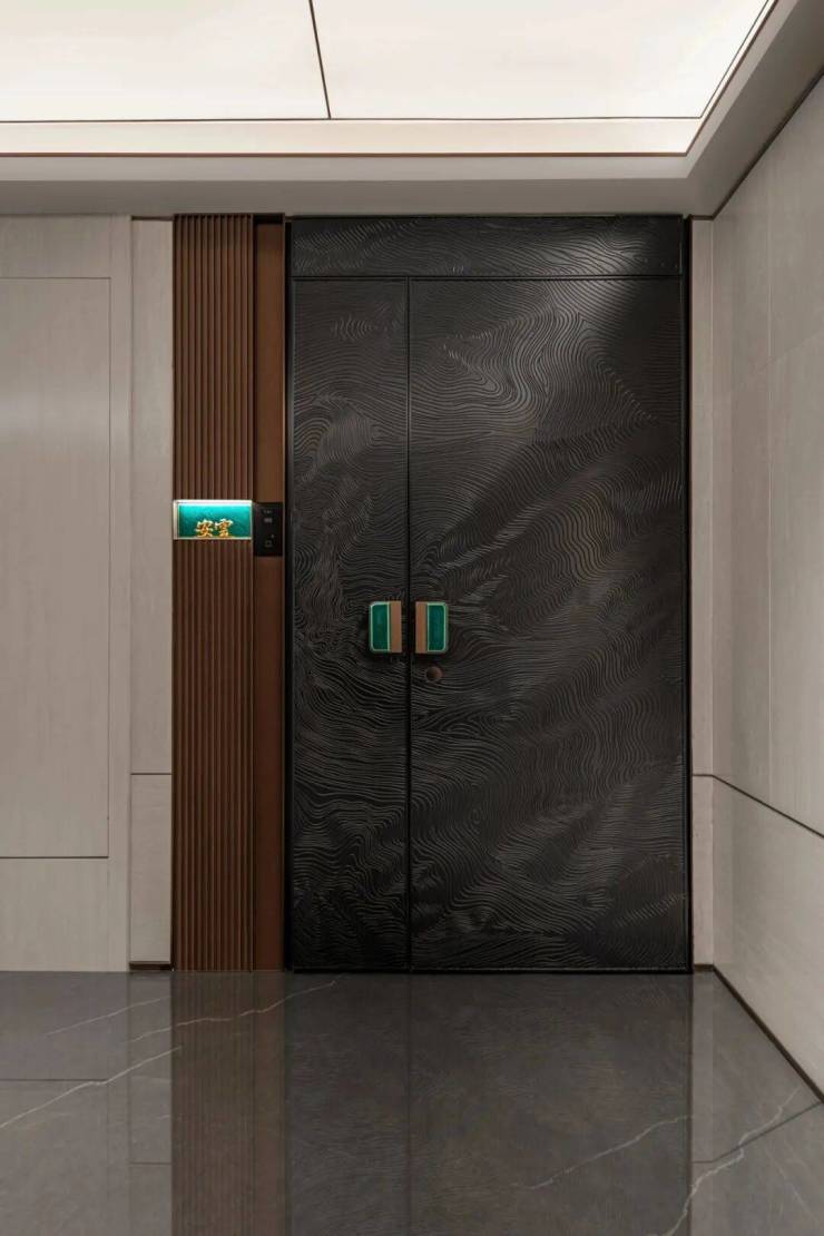 还有首层轿厢内电梯门也特别做了定制细节处理,使用金属蚀刻工艺不锈钢电梯门,高定专属纹案,近看能摸到细腻的凹凸质感;电梯厅内采用维多利亚绿奢石和温德姆灰石材打造,匹配类独厅设计的归家尊仪……奢石大量运用于公区,与超级豪宅相比都毫不逊色。