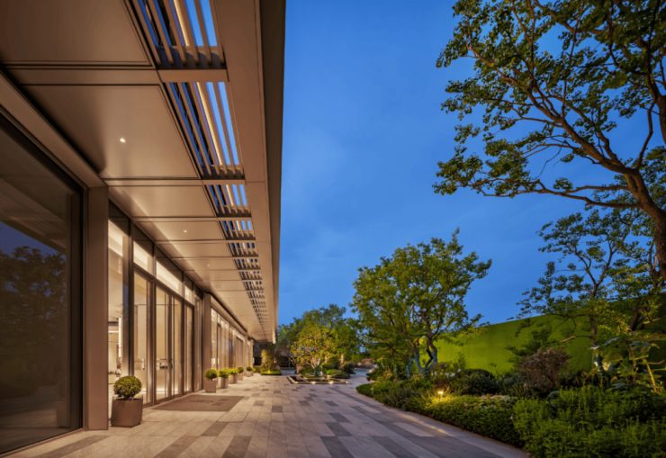 同时,社区内部景观打造了大面积的叠级水景,搭配普拉达绿大理石和浪淘沙石材,呈现整体空间的隐奢基调。